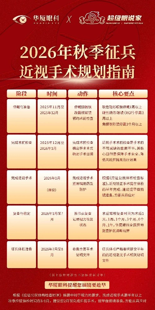 时间沙漏已为2026年秋季征兵悄然开启。心怀军营梦的近视青年们,若你计划通过近视手术迈过视力门槛,此刻就必须将“提前量”置于规划核心。